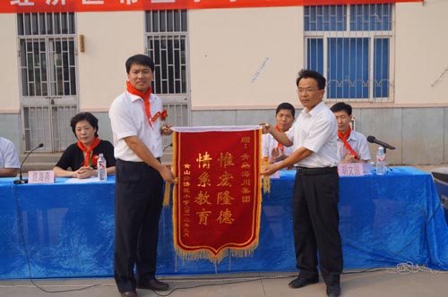 9月20日下午,秋高氣爽、陽光明媚,膠南市黃山經濟區(qū)希望小學落成儀式在學校大操場隆重舉行。激昂的國歌聲后,少先隊員們?yōu)槌鱿I導敬獻紅領巾,以此來表達孩子們的崇高敬意。一位學生代表用稚嫩的童音道出了對青島海川建設集團及支持希望工程事業(yè)建設的各類愛心團體的誠摯感謝,和臺下上千名含苞待放,映襯在陽光里的一張張幸福笑臉一樣,他們都是祖國的未來和希望,也讓在場的每一位成年人對“捐資助教、功德無量”這句話有了更深刻的理解和感悟。黃山經濟區(qū)希望小學校長懷著激動地心情向海川集團贈送錦旗一面,愛心助學的善舉也贏得了在場師生一次又一次熱烈的掌聲。集團黃中坡副總裁代表發(fā)言,他特別指出,今年恰逢集團成立60周年之際,本著“節(jié)儉辦大慶”和“注重社會公益性”的宗旨,集團將主要活動資金拿出來援建黃山經濟區(qū)中心小學,另外發(fā)動企業(yè)職工向老一輩建筑人曾經援建過的四川藏族甘孜地區(qū)捐獻衣物。通過一系列與社會接軌的主題活動,力爭將本次大慶辦得更有意義。最后他衷心希望膠南市黃山經濟區(qū)中心小學的全體同學從小樹立遠大目標,刻苦學習,努力向上,爭做國家棟梁之才,立志回饋社會,報效祖國。青島團市委副書記張海軍和膠南市委副書記佟海燕也出席儀式并與海川集團黃中坡副總裁一起為希望小學揭牌,同時就海川集團對教育公益事業(yè)的傾情參與和大力支持給予了充分肯定和高度評價。