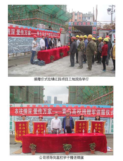 10月16日下午,由青島理工大學土木學院學生會牽頭組織,青島大學和中國海洋大學共同參加的“衣往情深,愛傳萬家”軍訓服捐贈儀式,在青島海川建設集團鎮(zhèn)江路項目工地隆重舉行。來自青島理工大學市北校區(qū)、黃島校區(qū),青島大學和中國海洋大學的學生組織代表出席了捐贈儀式,青島海川建設集團副總裁李尊強、團委書記王群、六分公司都市逸品項目部經理劉峰官以及所在項目部分工人代表出席了捐贈儀式。