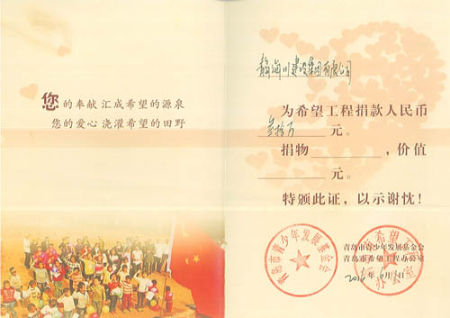 海川集團多年來一直把履行社會義務(wù),回饋社會,報效祖國作為企業(yè)的重要職責(zé),在企業(yè)發(fā)展的同時,不忘社會公益事業(yè),十幾年來已向社會公益事業(yè)捐款累計超過460萬元:先后向青島市教師素質(zhì)專項基金捐款30萬元,捐建貴州江口縣雙江鎮(zhèn)希望中學(xué)30萬元,捐建膠南市黃山鎮(zhèn)希望小學(xué)30萬元。并通過基金會捐助惜福鎮(zhèn)后金小學(xué)多臺電腦用于教學(xué),2013年4月,又向惜福鎮(zhèn)“為了惜福孩子的明天”大型公益活動捐款30萬元。另外,在汶川地震期間,組織廣大職工開展賑災(zāi)捐助活動,奉獻愛心,先后向市紅十字會捐款129690元,榮獲“紅十字博愛銀獎”。近年又為惜福鎮(zhèn)教育基金捐款300萬元。2014年至今,連續(xù)三次組織員工積極開展無償獻血公益活動,緩解了島城醫(yī)療機構(gòu)臨床用血的緊張局面,充分體現(xiàn)了海川集團及廣大員工的社會責(zé)任感和無私奉獻精神。