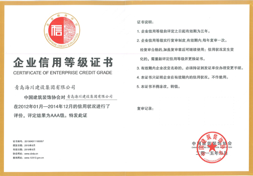 “企業(yè)信用評價AAA級信用企業(yè)” 是中國建筑裝飾協(xié)會遵循公平、公正、公開的原則,為推進(jìn)企業(yè)社會責(zé)任、提升企業(yè)公信力、增強消費者信心、樹立行業(yè)誠信標(biāo)桿而開展的評選活動,只有行業(yè)內(nèi)規(guī)模較大、市場占有率較高、經(jīng)營效益水平較高,且在業(yè)界具有良好信譽評價的企業(yè)才能最終獲評。青島海川集團(tuán)憑借規(guī)范的企業(yè)運作和誠信經(jīng)營光榮登榜。